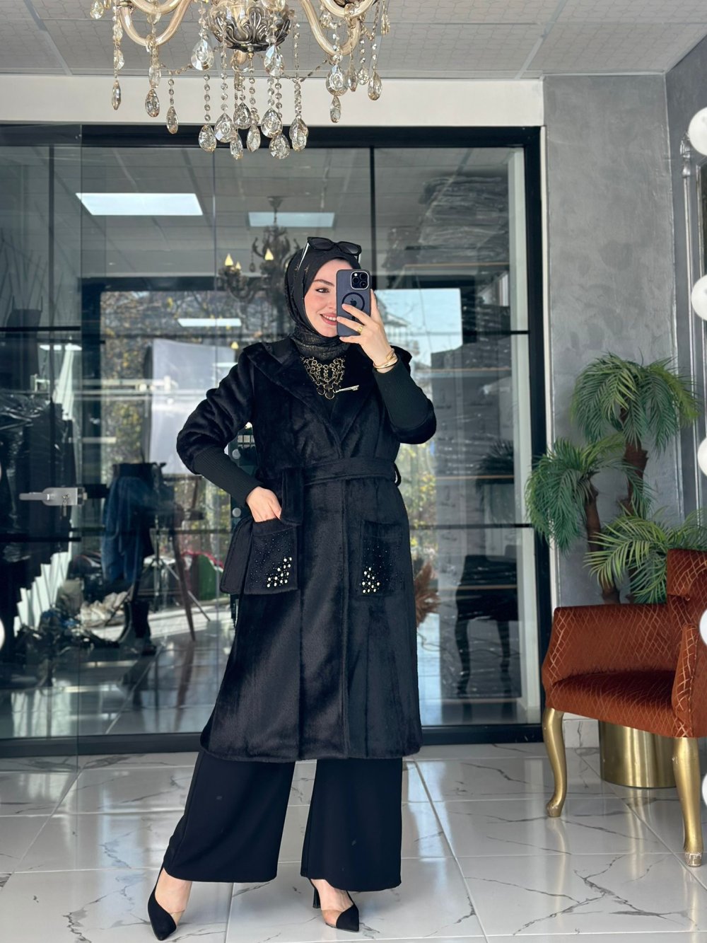 Kumaşı angora kumaştır. Kol ağızı ribanalı,Kapşonlu,kuşaklıdır