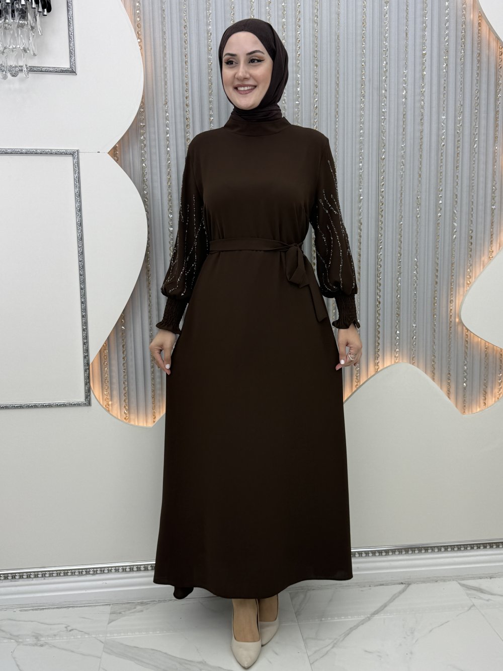 Arşin Taşlı Elbise Kahverengi