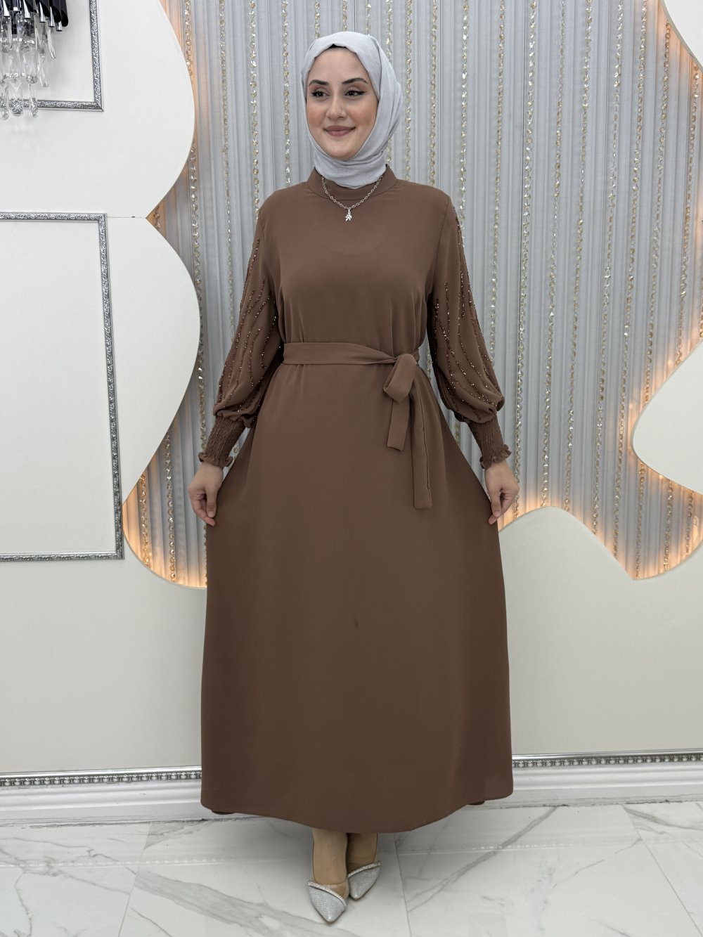 Arşin Taşlı Elbise Sütlü Kahve