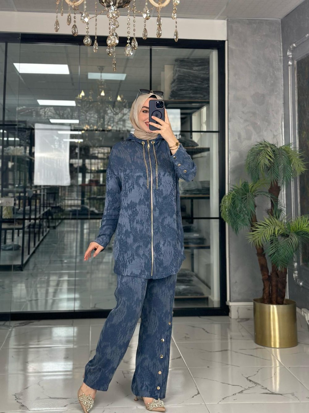 Qupra Kumaştır. Ceket Boydan Fermuarlı,Kapşonlu ve Yaka Zincir Aksesuarlıdır. Kol ve Pantolon Metal Çıtçıt Detaylı,Ceket Sahte Cep Detaylıdir.Pantolon Beli Lastiklidir.