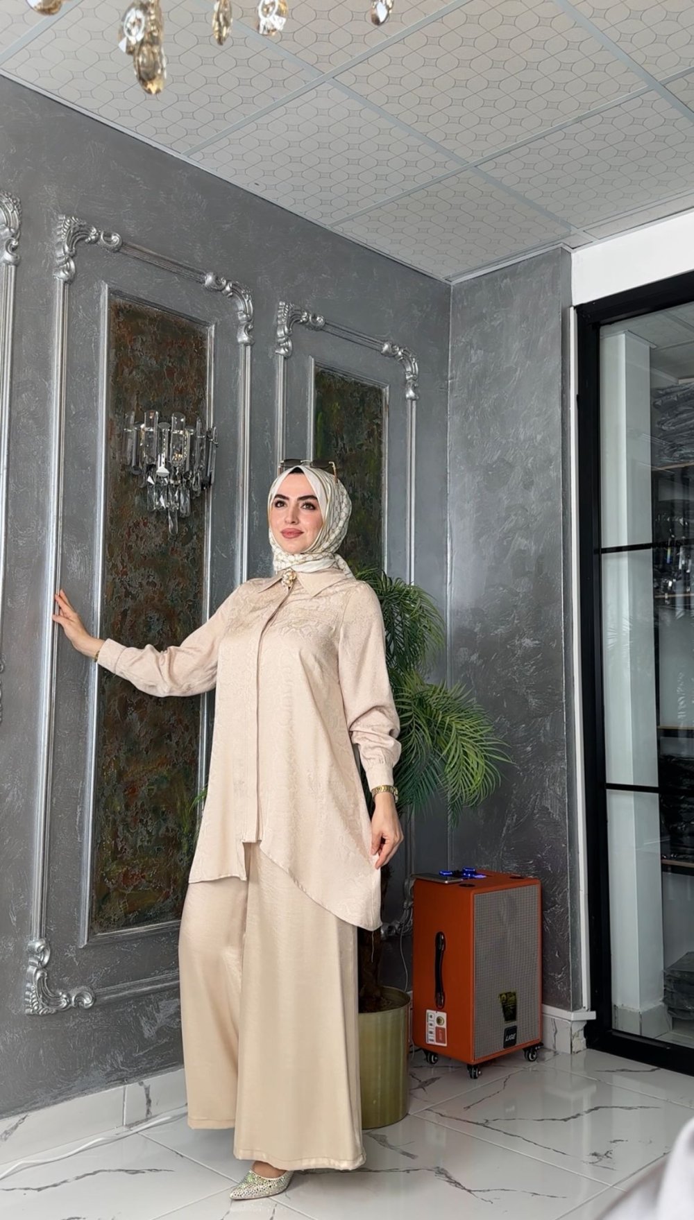 Jakar  Kumaş,Asimetrik Model,Gizli Pat,Aksesuar Detay,Arkası Pile ve Apolet Detaylı,Kol Manşetli, Bol Paça Rahat Kalıptır. Cepsizdir.