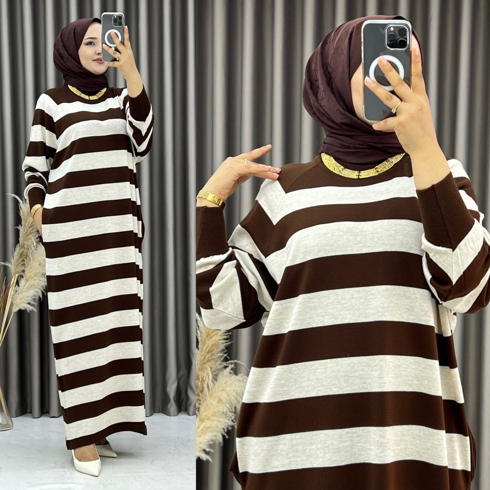 Elya Çizgili Elbise Kahverengi Kahverengi