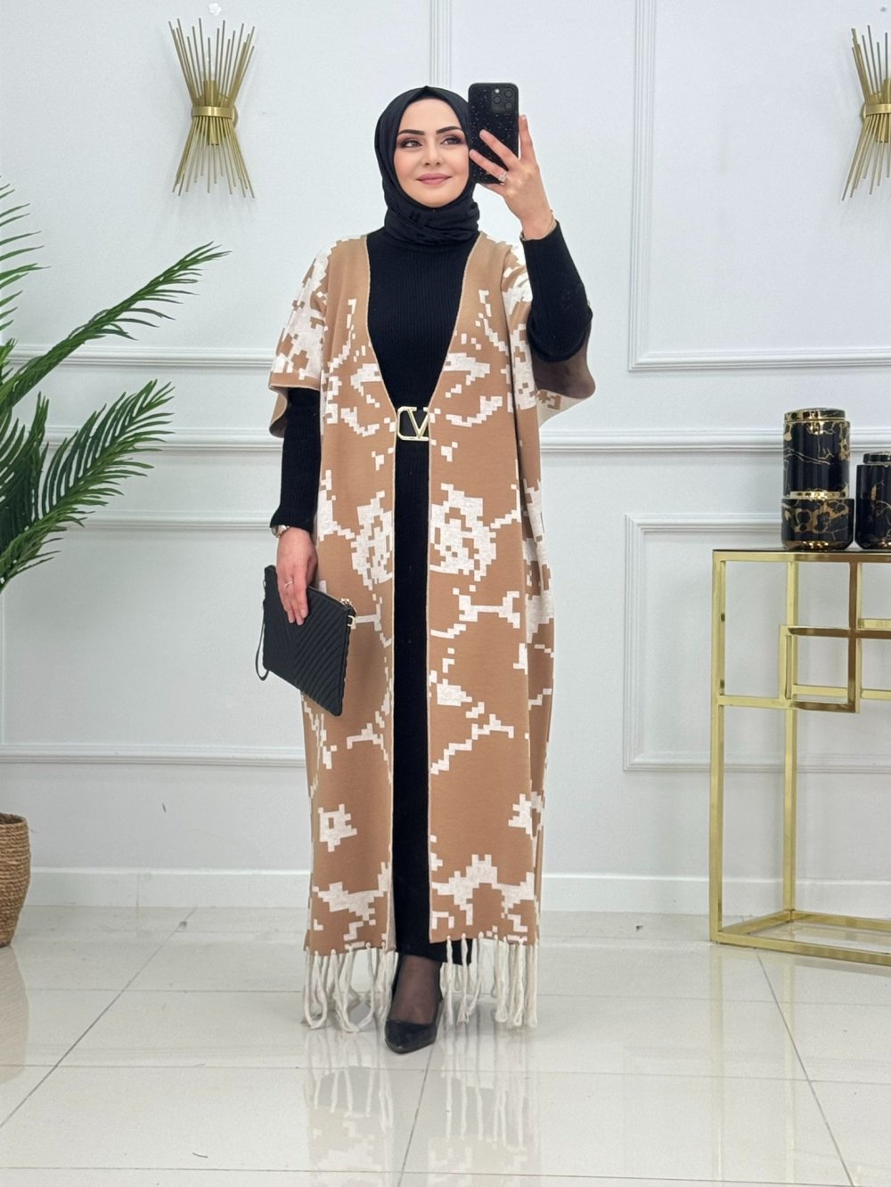 ?Ürün uzun kollu triko elbise ve kimono yelek olarak iki parçadan oluşmaktadır