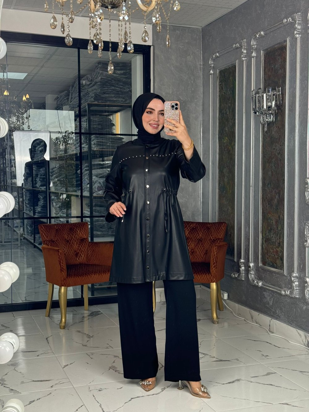 Kumaş Sıvama Deri, Çıtçıtlı, Belden Büzgülüdür. Göğüs taş işleme,Ceplidir...