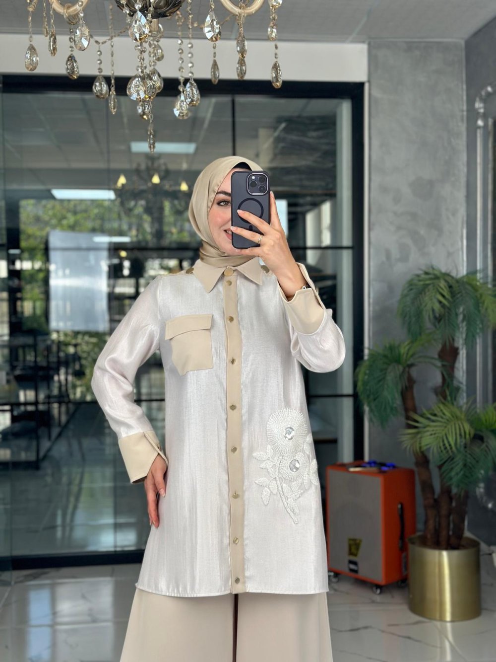 Gömlek Krep Jakar Kumaş,Pantolon Pırlanta Krep Kumaştır. Gömlek Ön Normal Patlı,Omuzlar Düğmeli,Gömlek Sağ Aplike Detaylı, Bolpaça,Rahat kalıptır.