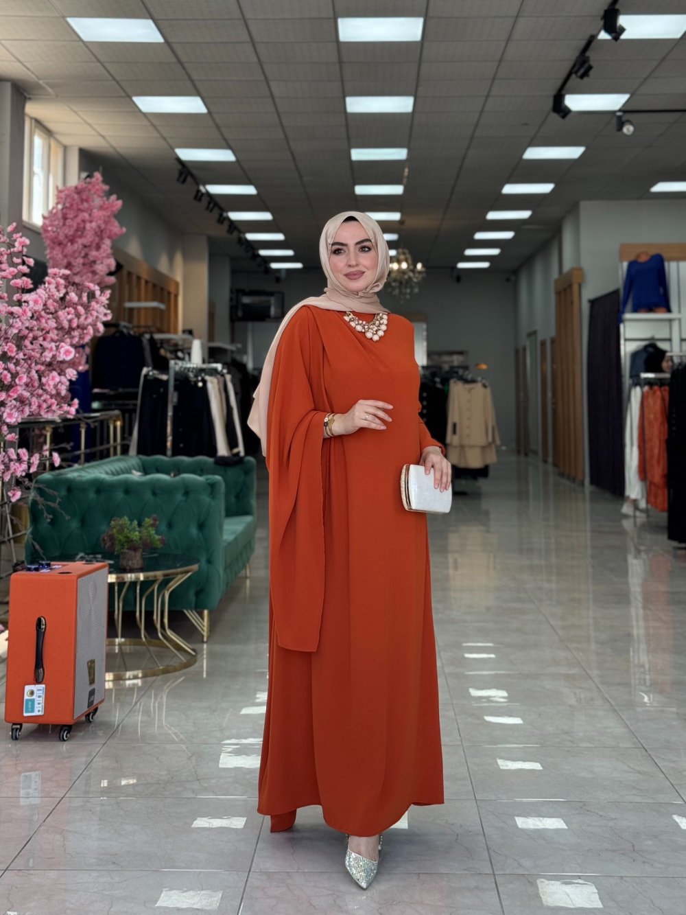 Albino krep kumaştır. Omuz pelerin kuşaklıdır.