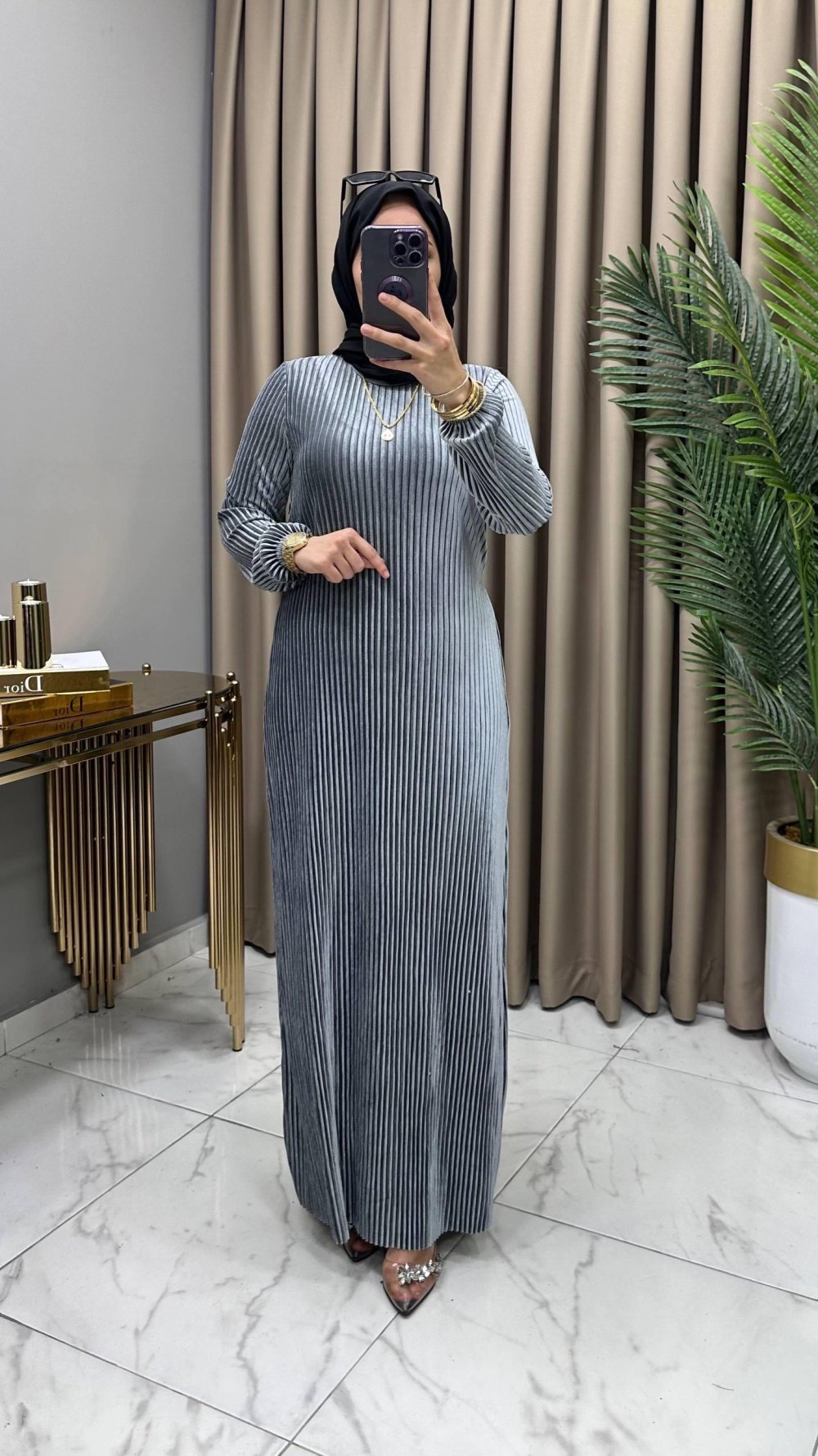 Multi Piliseli Kadife Elbise Gri