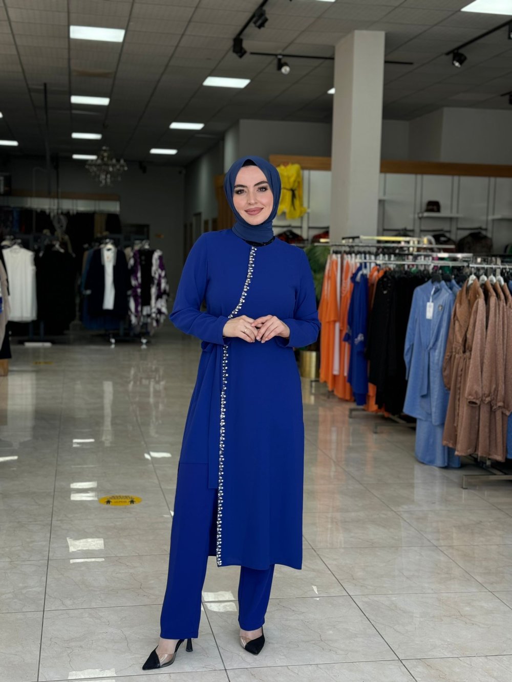 Kumaşı petek kreptir. Taşları yapıştırmadır. Kuşak detayı vardır.