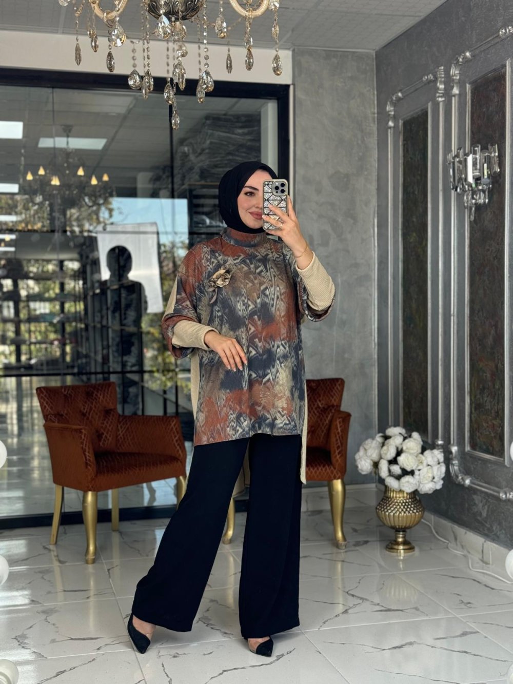 Örme Kumaştır. Arkası Uzun, Yaka Gül Bronşlu