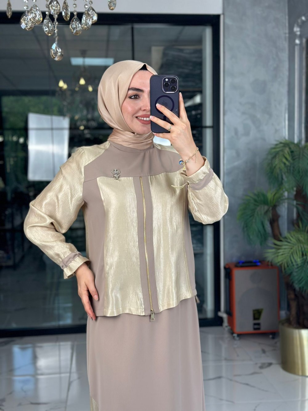 Dokuma Krep ve Parlak Modal Kumaştır.Yarım Fermuar Detaylı,Kol Ağızı Lastik Stoperli, 2cm Dik Yaka,Broş Aksesuarlı,Etek Beli Lastikli,Rahat kalıp Etek Yan Detay Lastik Stoperlidir.