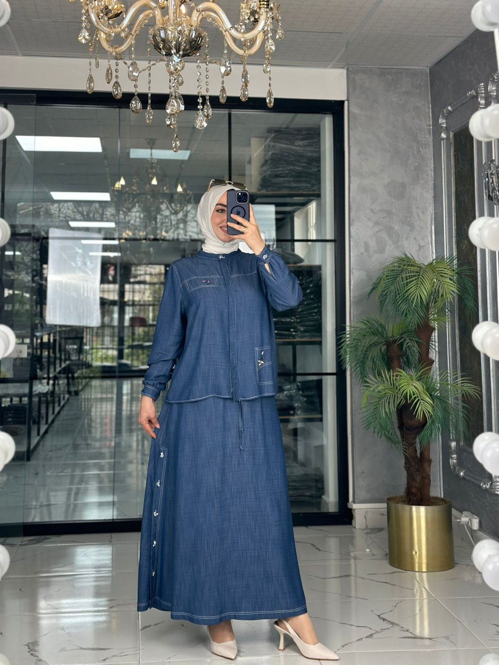 Tencel Kot Kumaş, Düğme aksesurlı, Ceket Arka Tünel Kuşaklı, Etek Cepli, Beli lastiklidir.